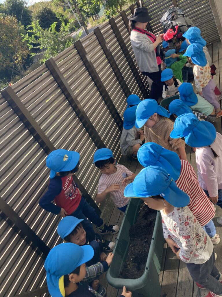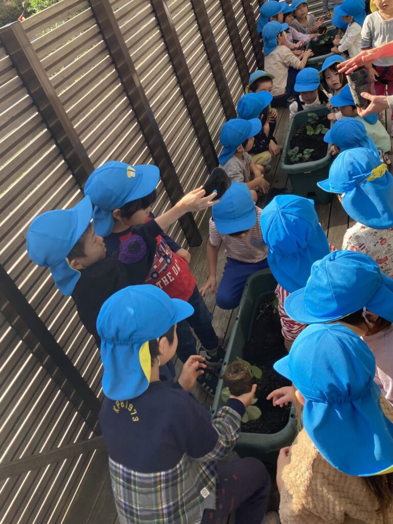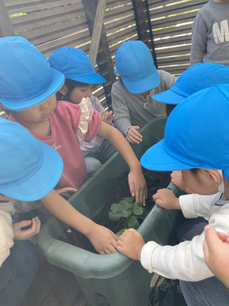 いちごが育つ苗を見ながらワクワクする子どもたち