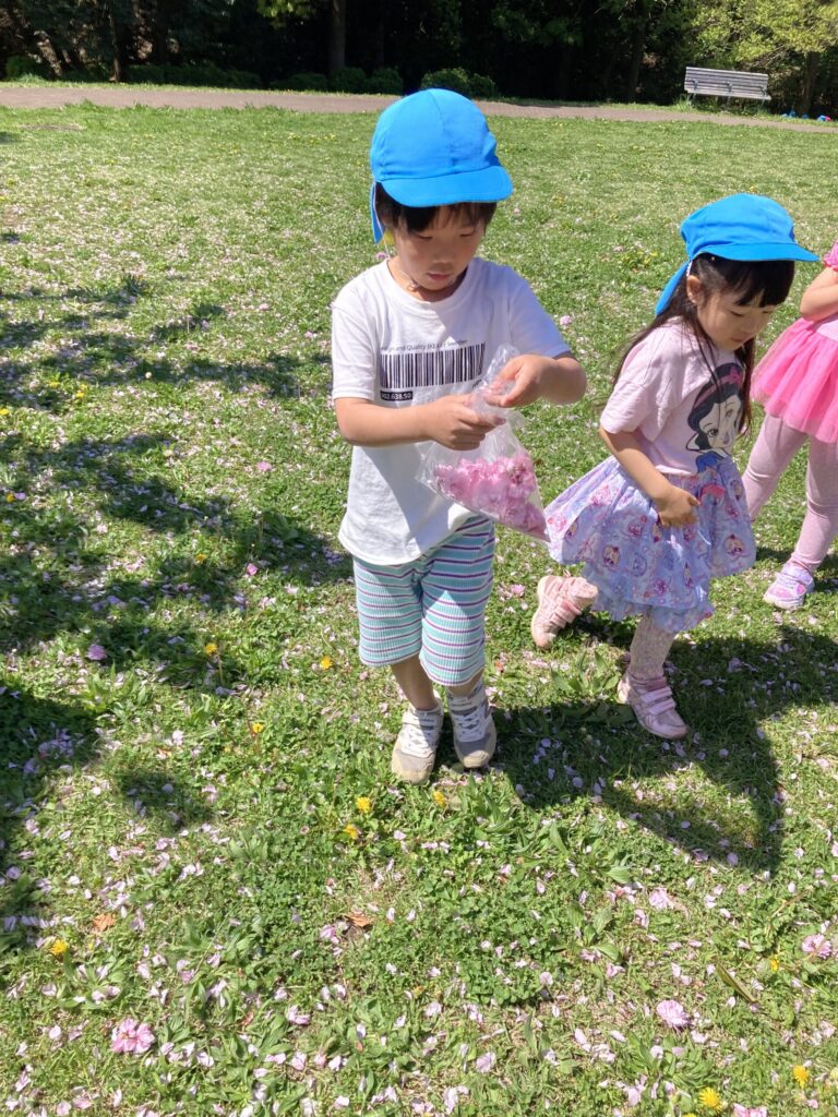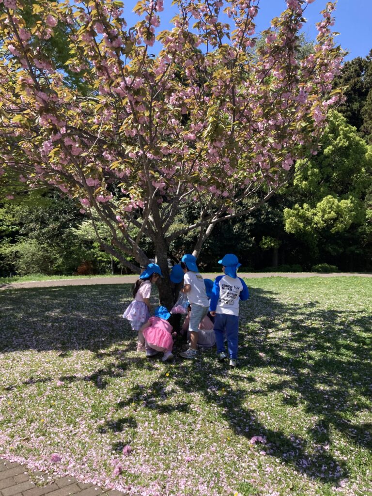 5歳児クラスでは、遅咲きの桜が咲き、桜の木の下で桜を集めている様子…