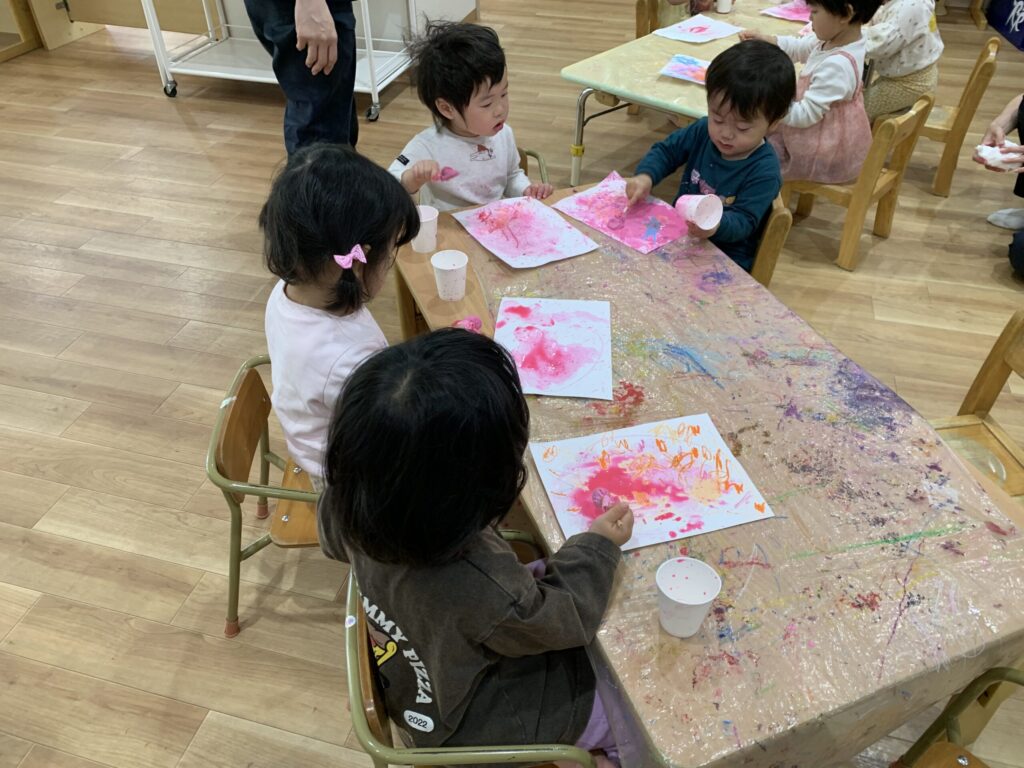 2歳児クラスでは、ピンクの絵具で桜を表現!