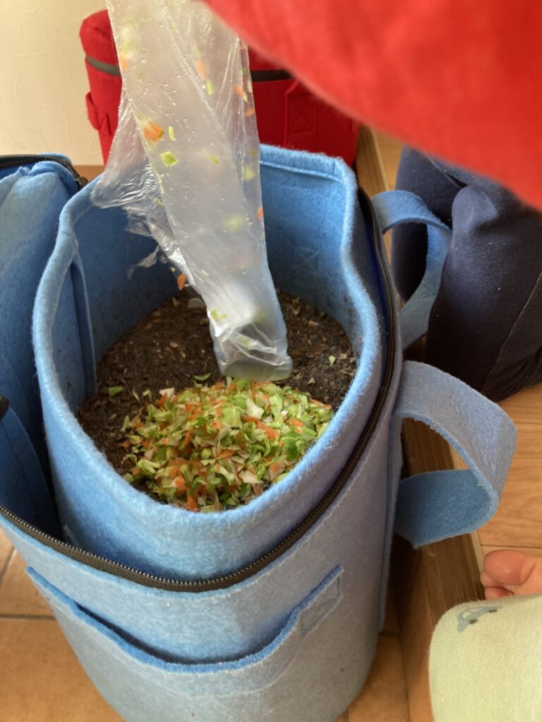 細かい野菜を袋からコンポストに入れていきます…