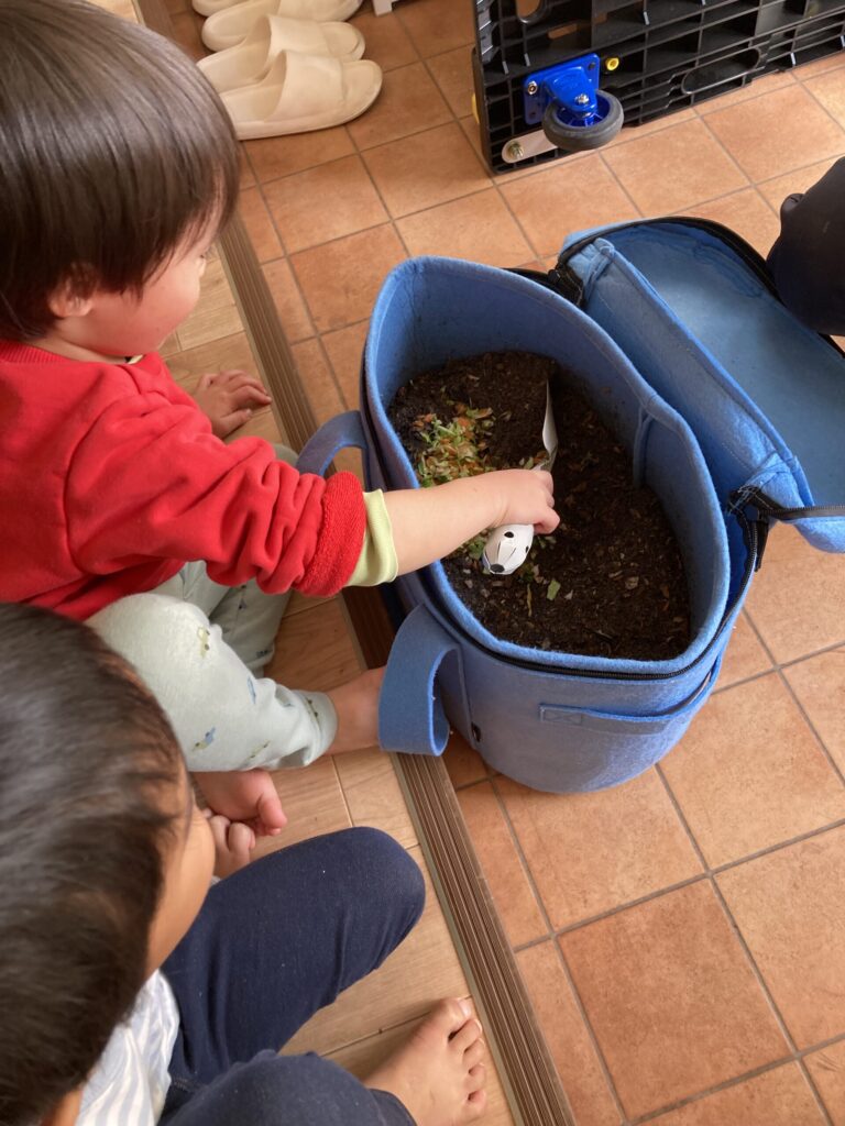 3歳児クラスでは、当番制でコンポストを行っているそうです!