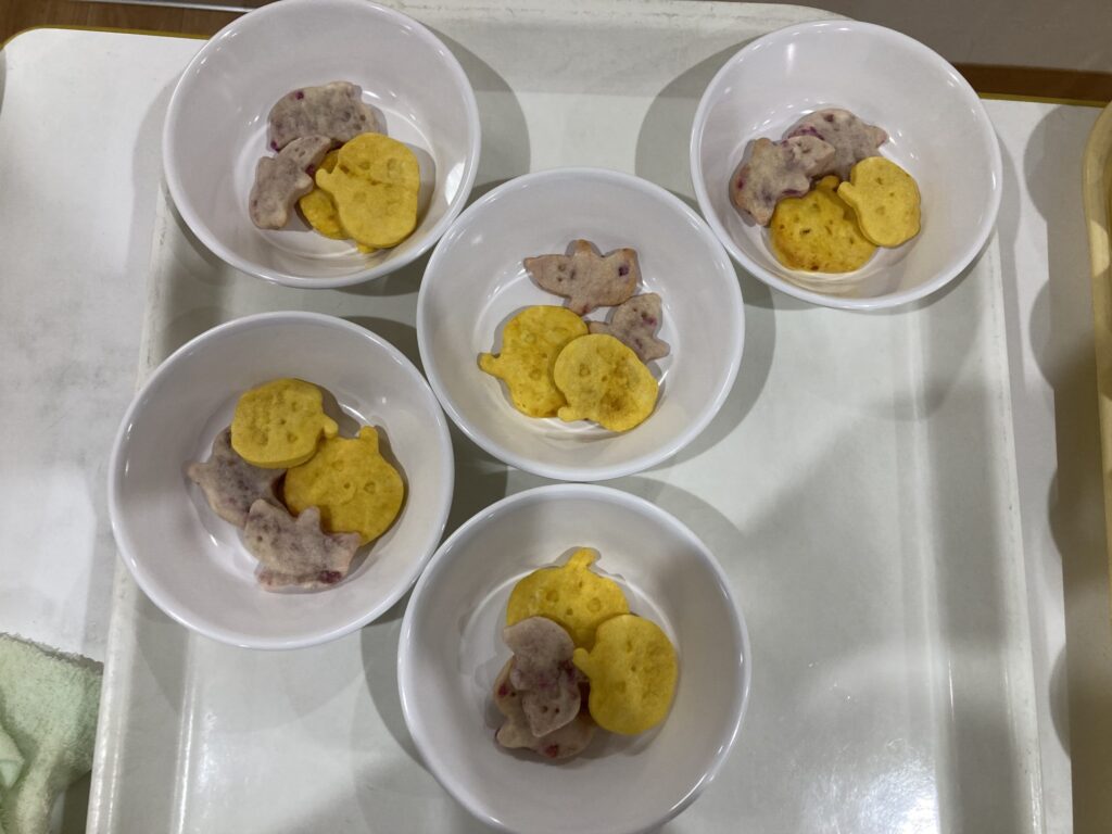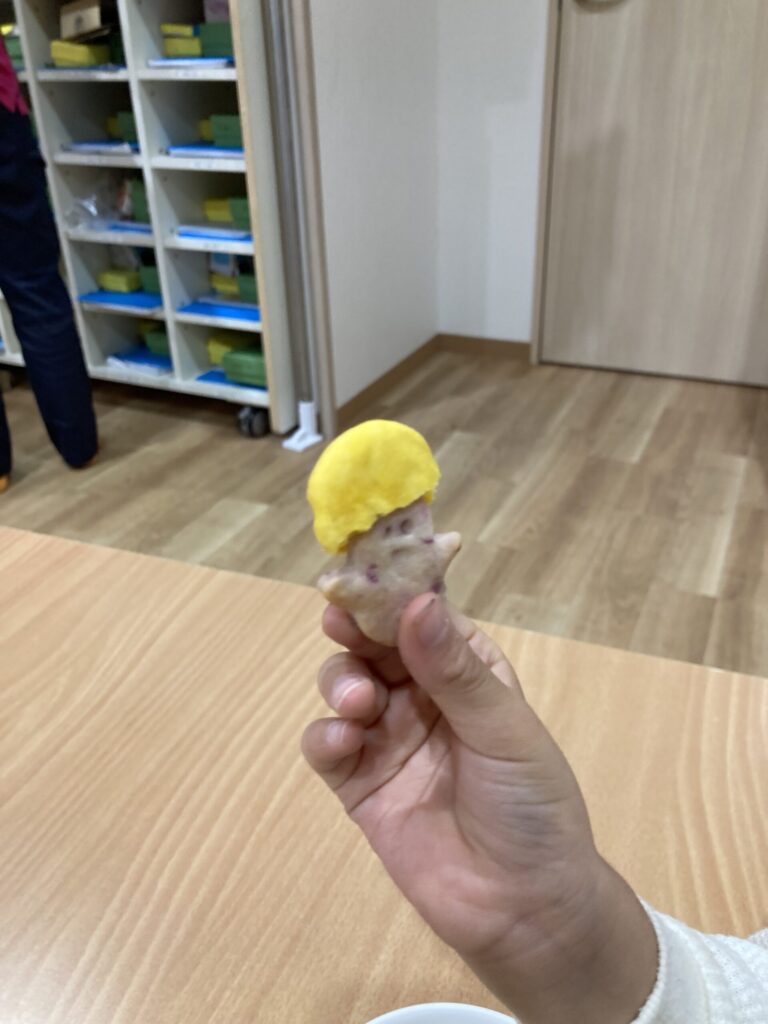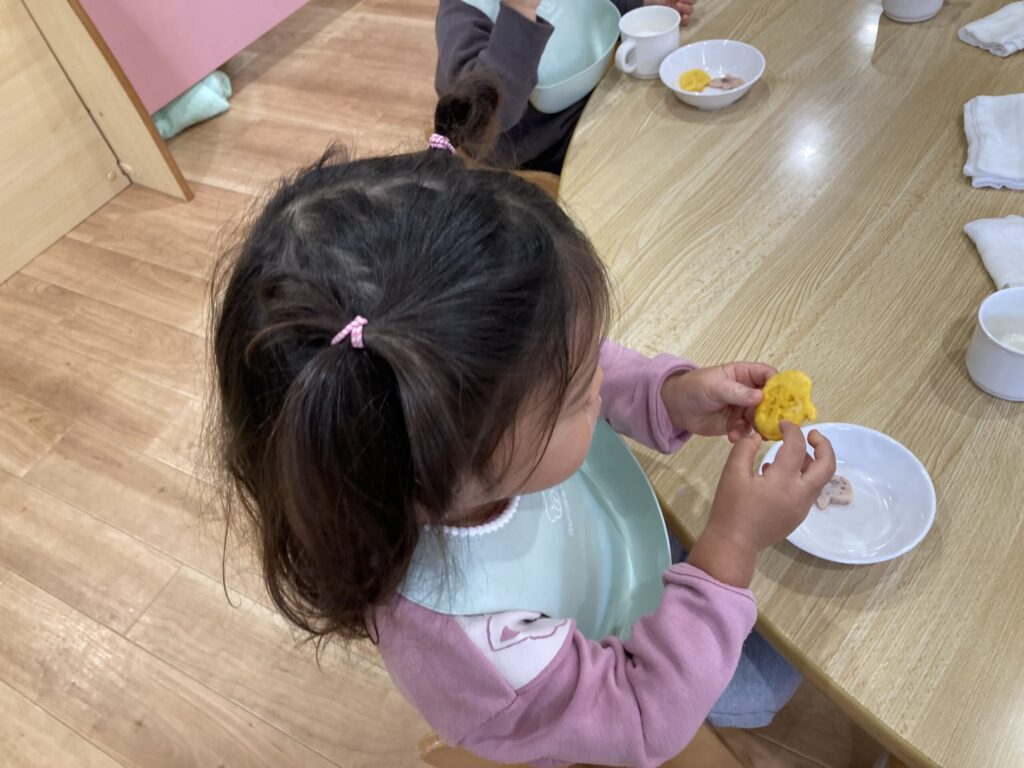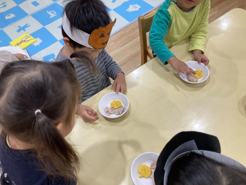 中には、お面を被って食べるクラスや、少し組み合わせておばけの髪の毛にしている子もいました!