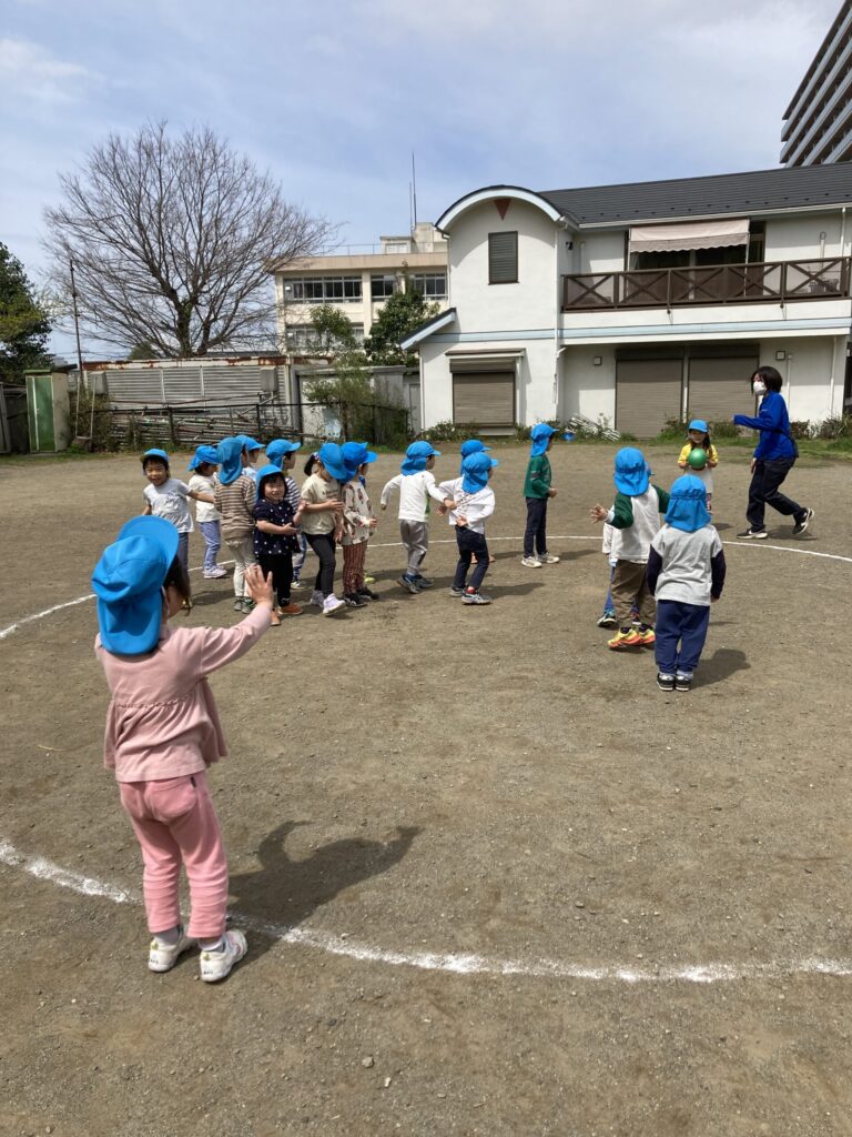 幼児クラスでは、丸い線を引いて、ボールが当たらないように逃げ回ります。
