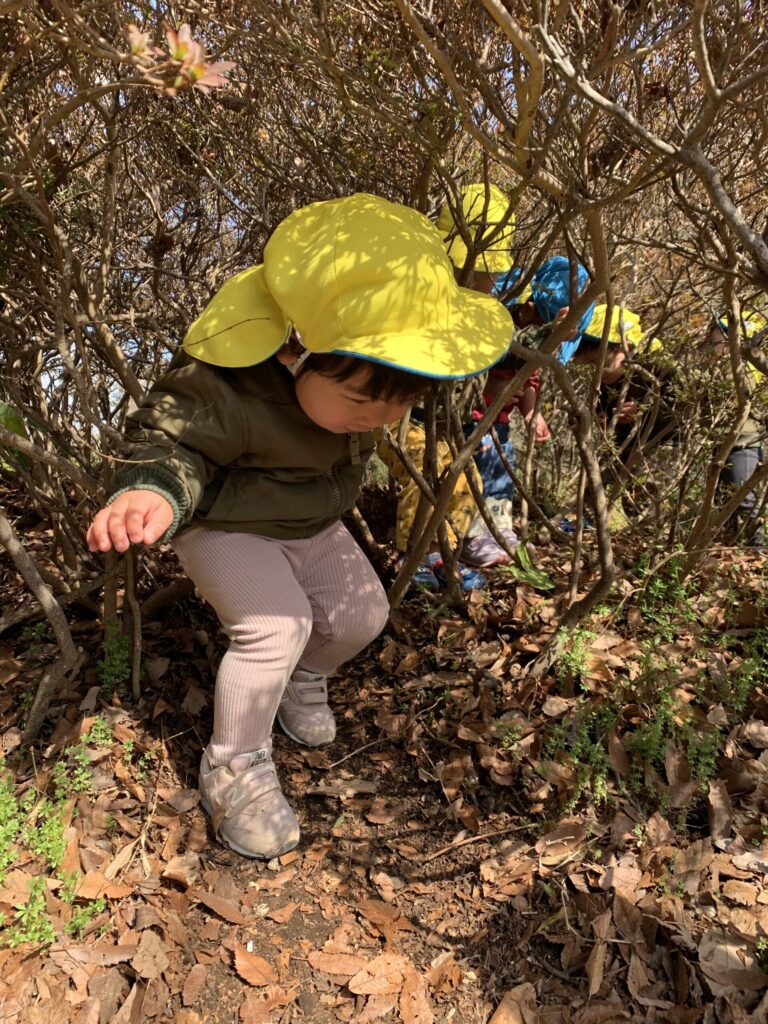 1歳児クラスは木のトンネルを発見!