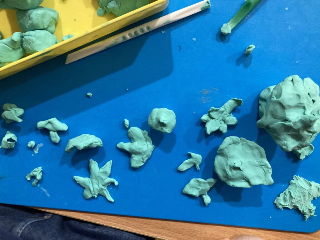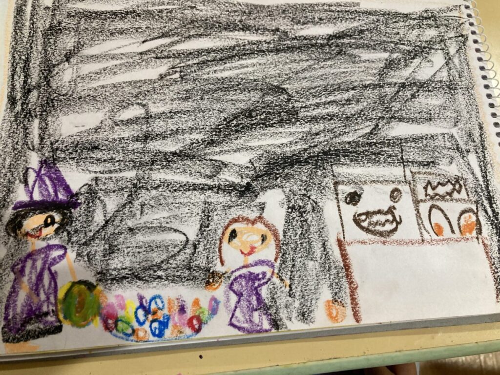 ハロウィンパーティーの思い出を、粘土と自由画帳に形にしています。