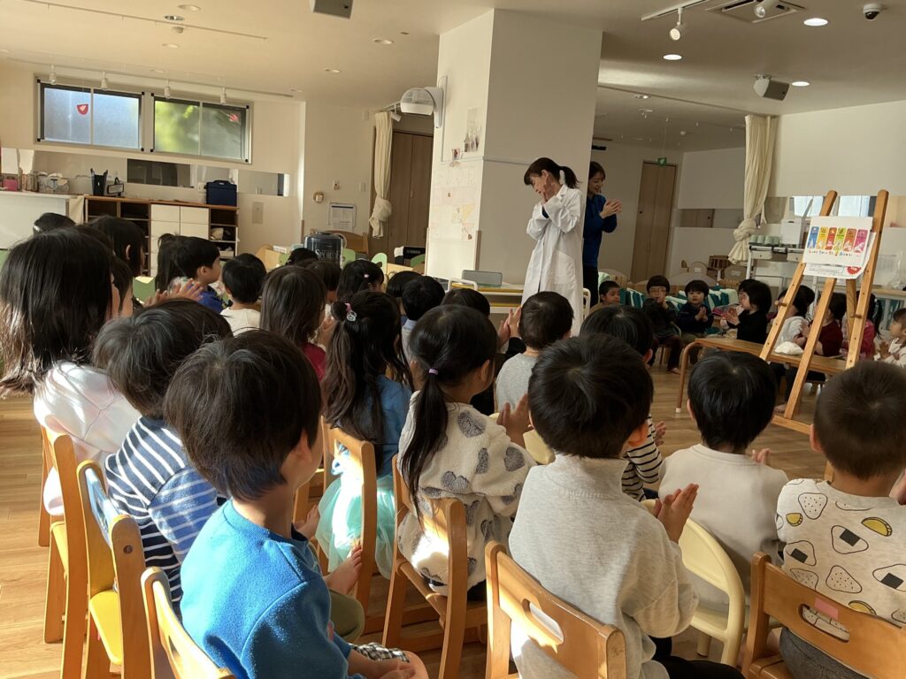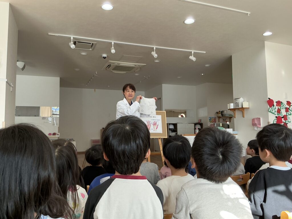 「手洗いできているかな?」ということで、手洗いの歌に合わせてみんなで練習をしました。
