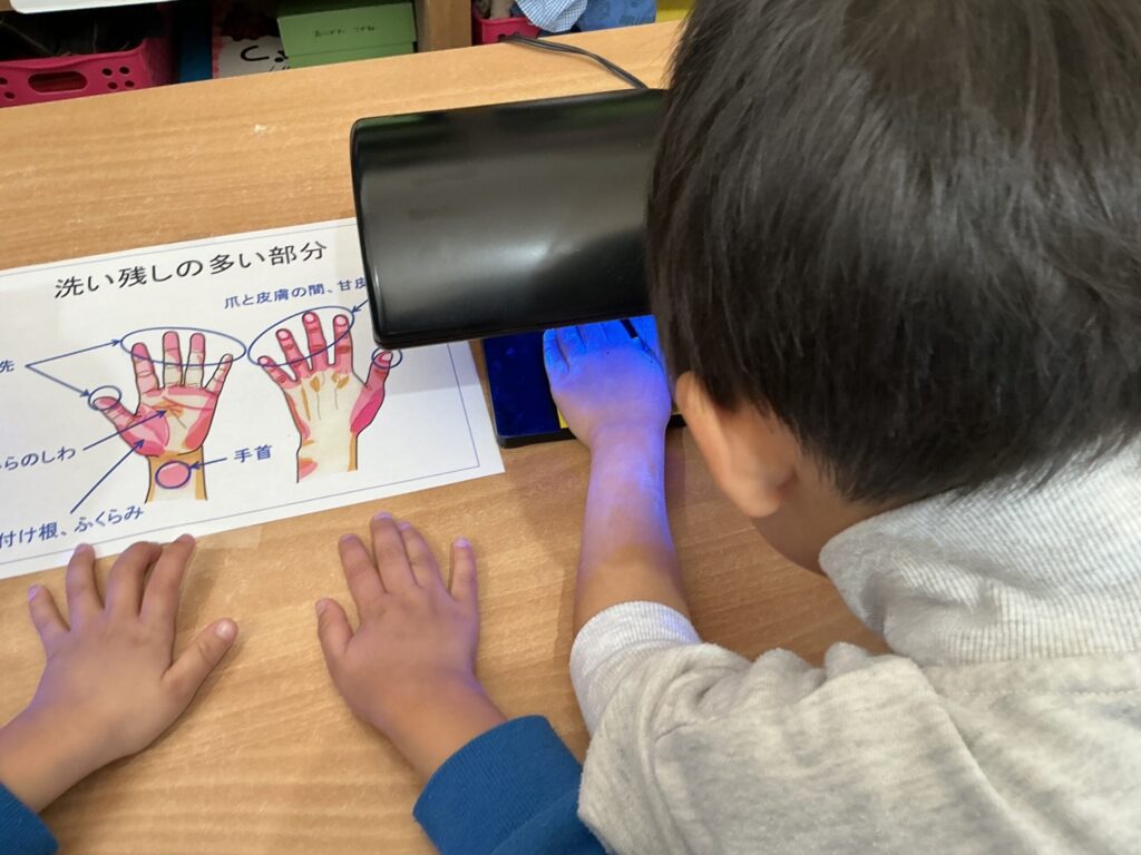 練習が終わり洗い残しがあるか目で見ることができる、手洗いチェッカーを使って手を洗いました!